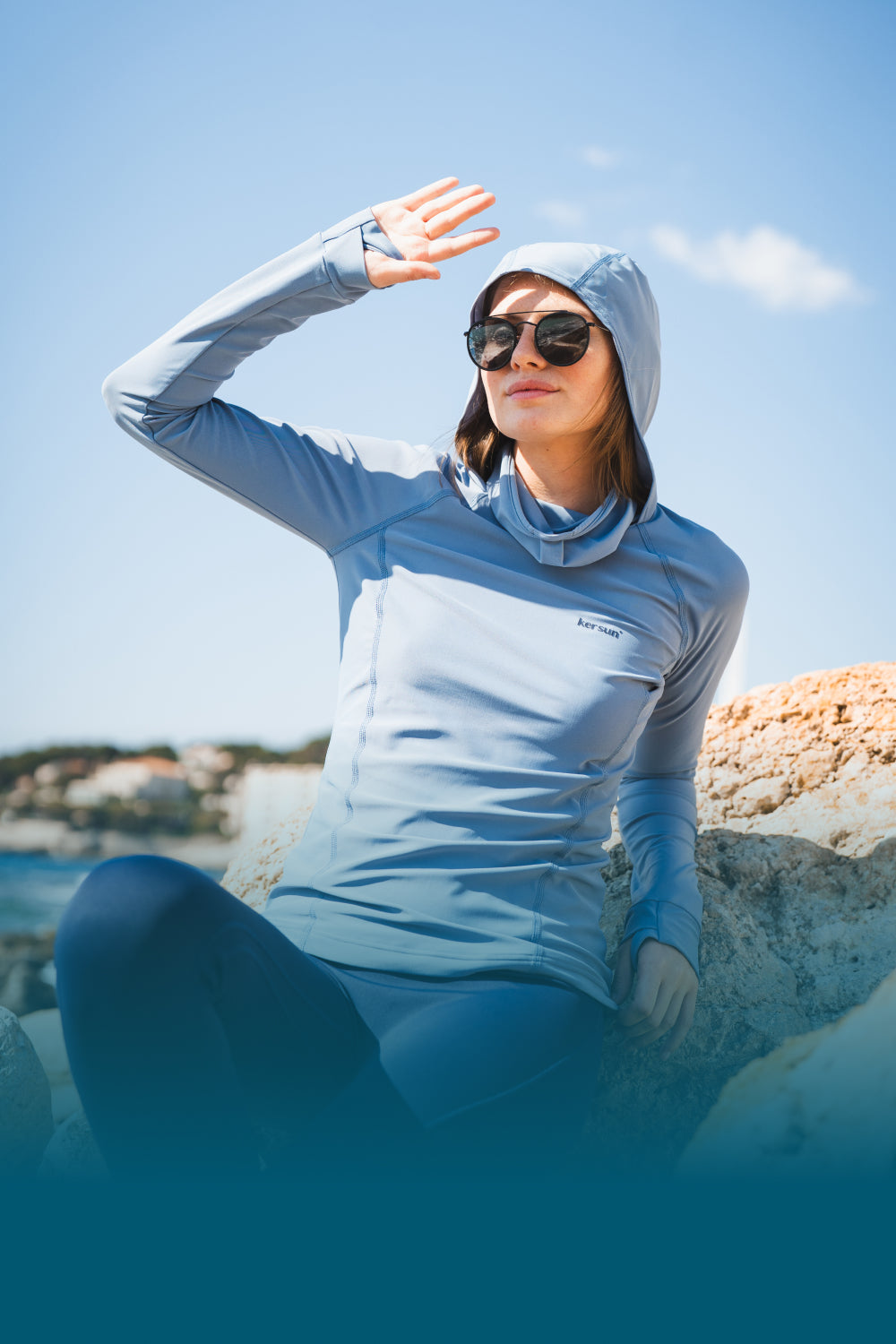 Originally created for surfers, a rashguard was cut to fit close to the body so it wouldn’t shift during intense surfing sessions. At Ker Sun, we wanted to make this UV swim shirt accessible to everyone, especially those with sensitive skin. We therefore offer cuts tailored for all aquatic activities, sailing, paddleboarding, swimming, kayaking, boating, coastline walks, or pool time. Our fashionable, comfortable UV swim jacket, our women’s looser-fitting t-shirts, and our high-neck swim shirts are perfect examples.