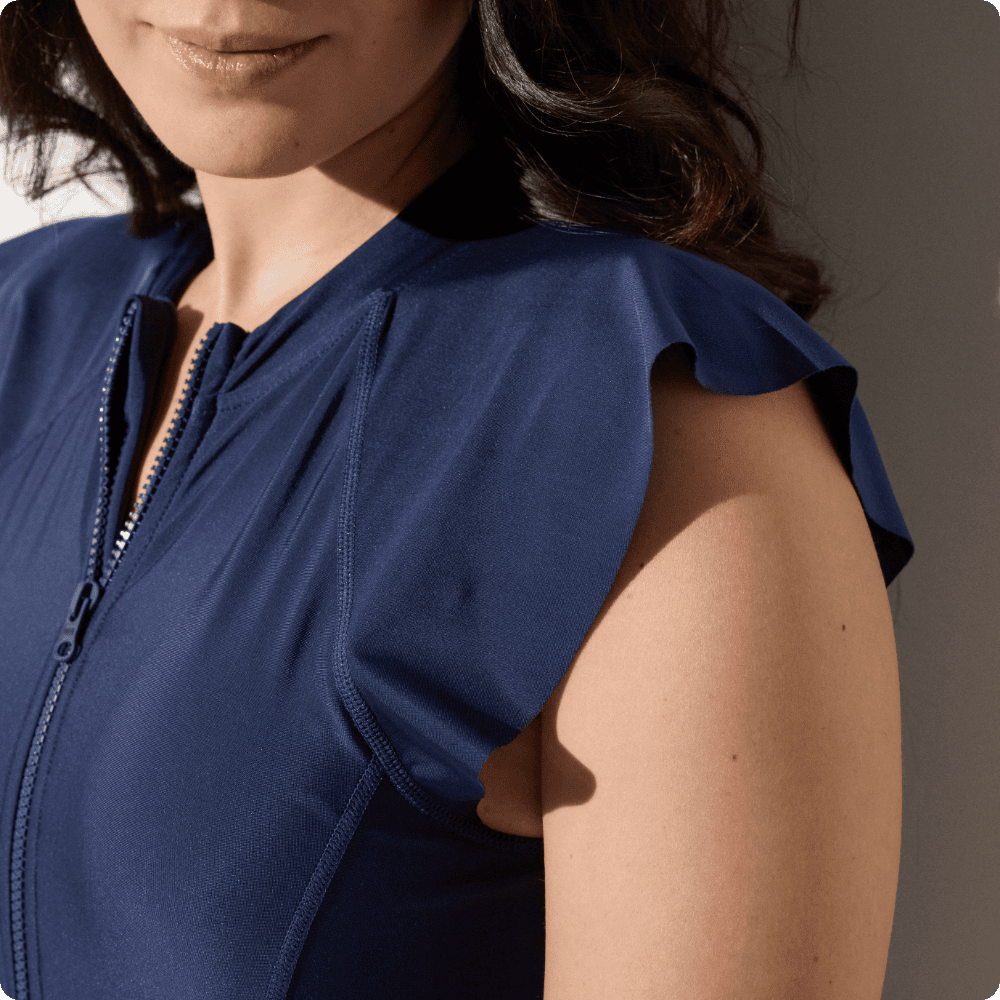 This one-piece swimsuit will effectively protect your shoulders and décolleté from the sun while adding a feminine touch to your silhouette.